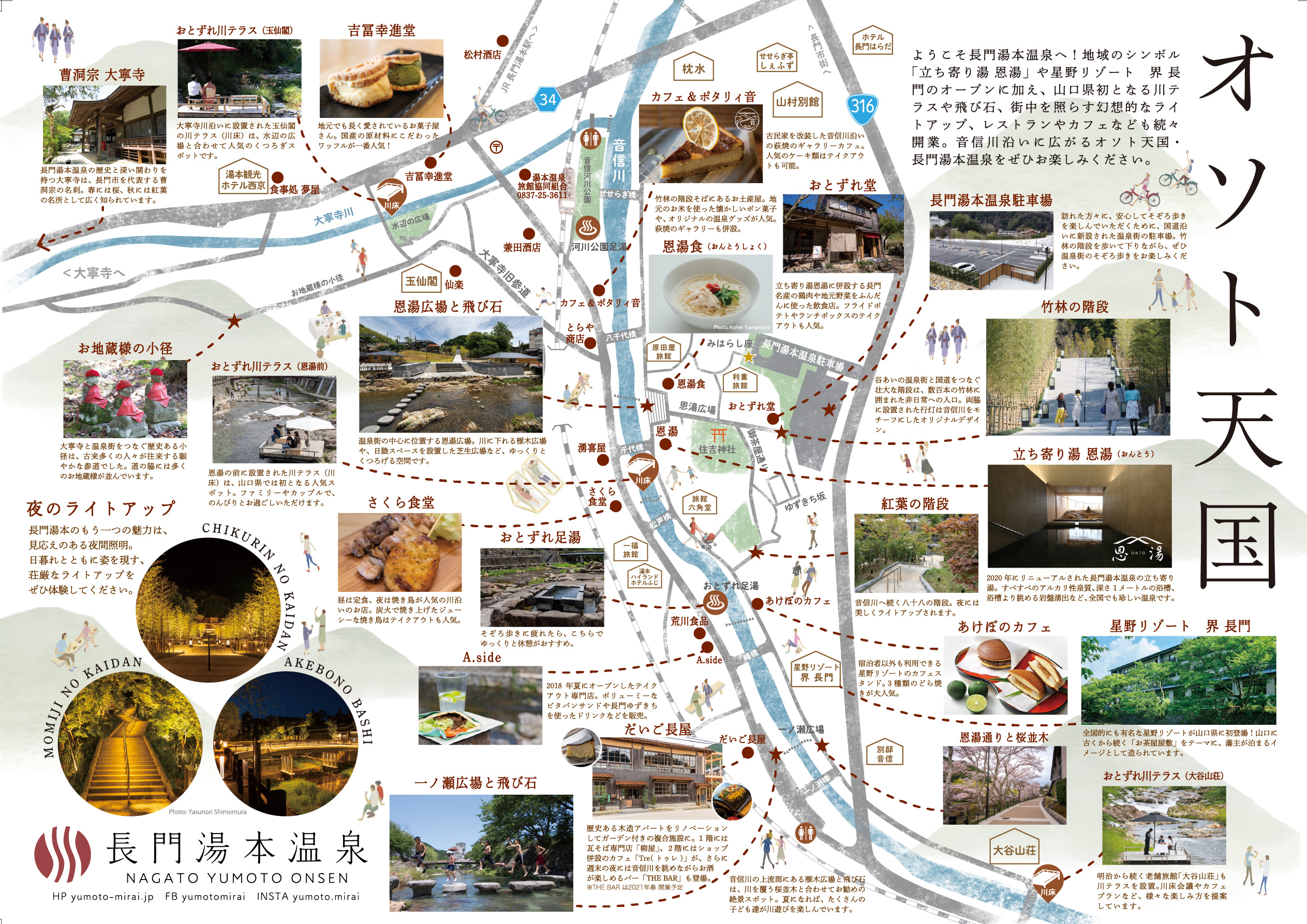 長門湯本温泉のまち歩きをより楽しくするための散策マップ「オソト天国MAP」が完成し、温泉街のいろいろなところで配布が始まっています。