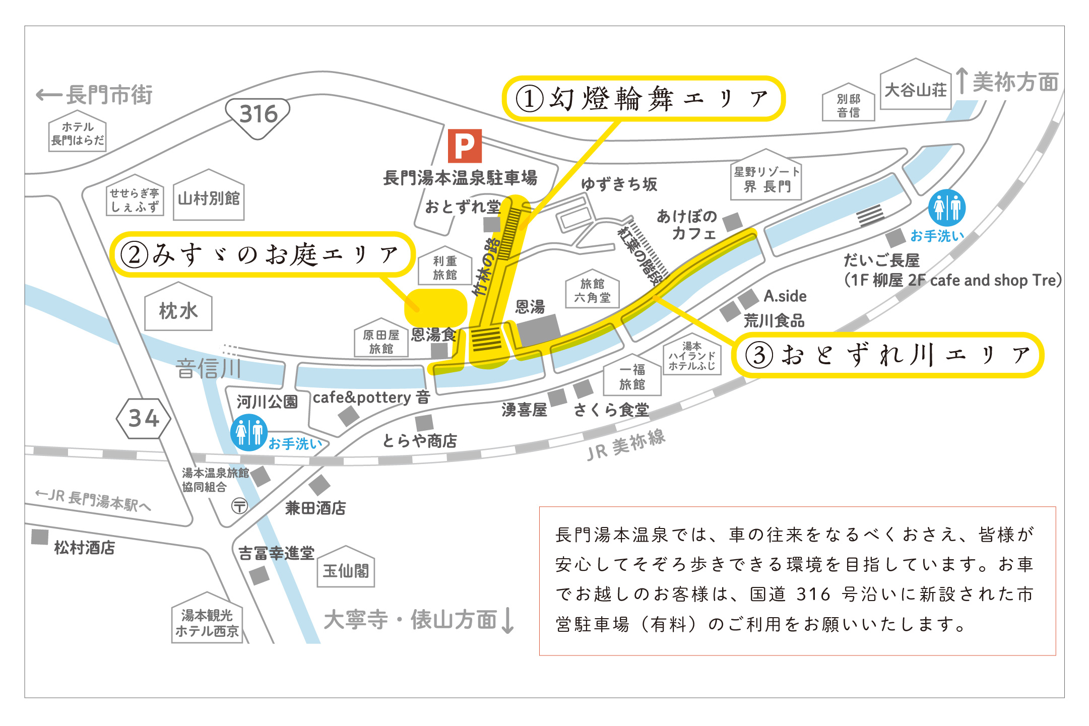 長門湯本温泉は、車の往来をなるべく抑え、皆様が安心してそぞろ歩きできる温泉街を目指しています。お車でお越しのお客様は、国道316号沿いの長門湯本温泉駐車場(市営・有料)をご利用ください。駐車場の情報はこちら>